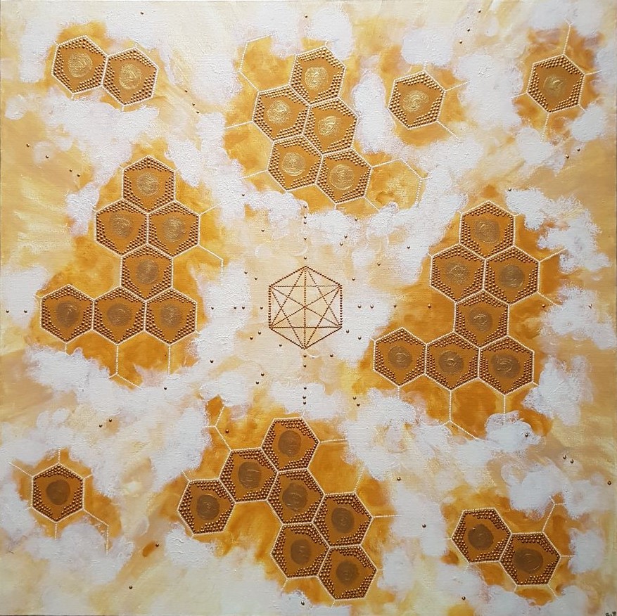 Det startede med jeg så ananas hele tiden. Så gik jeg nærmere ind i ananas'ens geometri og jeg hørte bi's summen. Jeg så efter bien, men der var ingen. Jeg fortsatte min research i geometriens verden, og en bi summede igen om ørerne på mig. Jeg fandt ingen bi. Dernæst var den lige foran ansigtet på mig i opblæst størrelse. Ved nærmere research erkendte jeg, at ananas og bier bruger samme geometri. Og så begyndte biernes ånd ellers at arbejde igennem mig - en slags trance. Efterfølgende ser jeg, at der er 33 kuber (mestertallet for I AM "Gud"). 6-takkede stjerne (og terning) i midten er selve bikuben (hovedgeometrien). Så blev jeg belært, at bier ikke flyver tilfældigt rundt, men følger meget præcise "linjer" og skulle flyve til og fra bikuben i 12 retninger med 6 bier i hver. Efterfølgende erkender jeg, at der er 12 x 6 = 72 bier, som er aktive på billedet (72 er endnu et mestertal og iøvrigt antallet af navne for GUD på hebraisk, som Kristus talte). Det lyse cremefarvede omkring kuber bobler let og er honningen, vi skraber af pladerne i bistager.