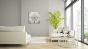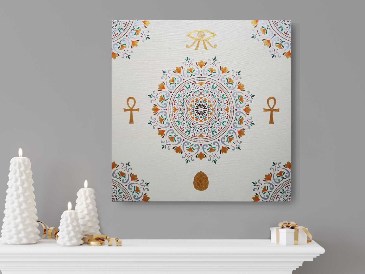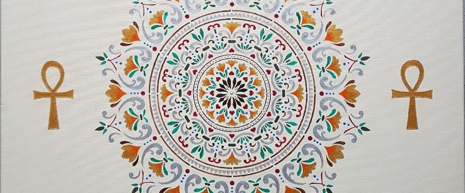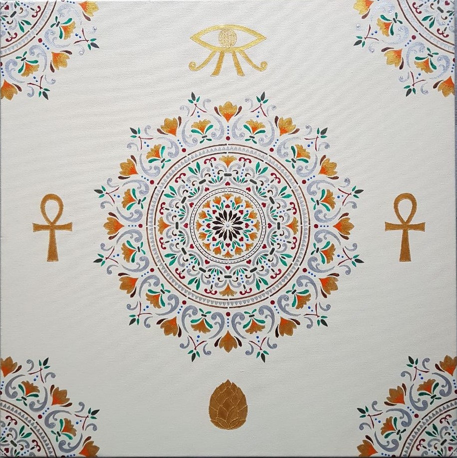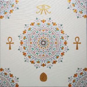 Farver som på Papyrus, Guds sande øje med livets blomst som pupil, Ankh for helbredelse og beskyttelse samt balance mellem maskuline og feminine energier og pinealkirtlen i bunden for den åndelige udvikling. Sølvglitter tilføjet.