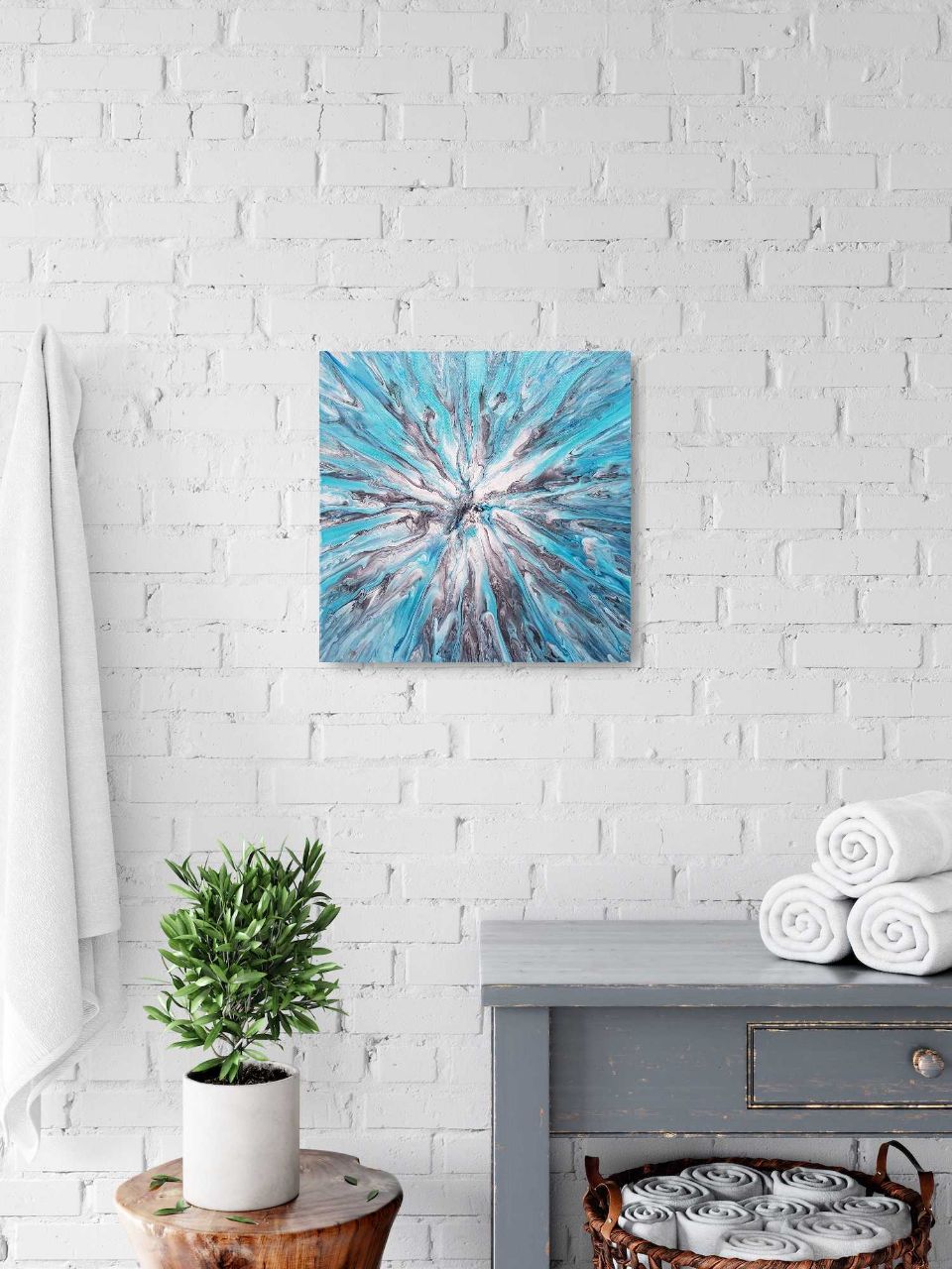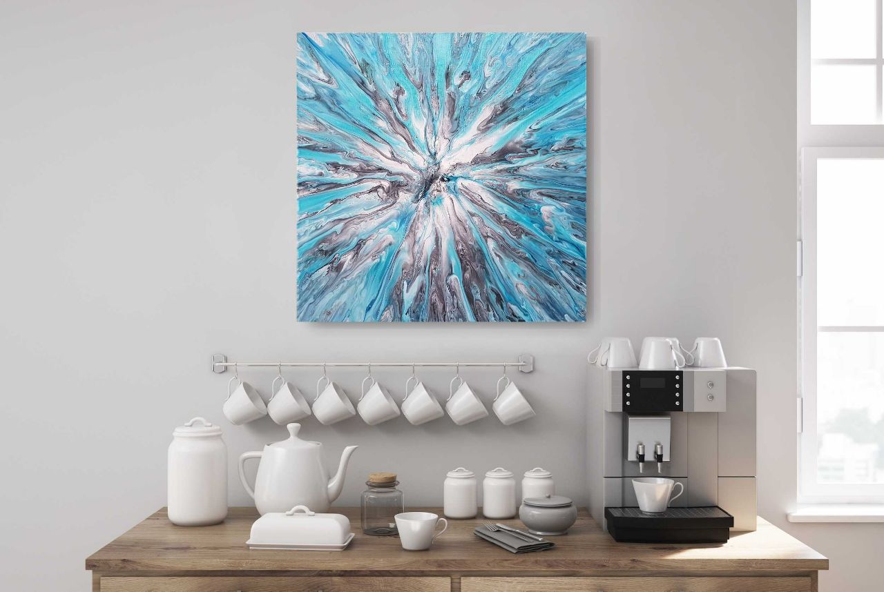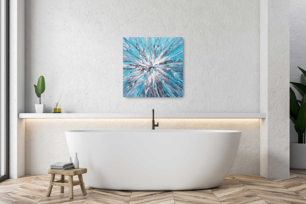 Maleriet er en lindrende hånd fra vores højere selv. Stil ind på maleriet og mærk friskheden, som havde du en dråbe pebermynte eller eukalyptus i munden og tog en dyb indånding. Lad friskheden brede sig til hovedet og resten af kroppen - slap af og giv slip!