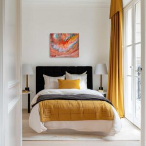 Maleriet er lakeret og kan modstå sollys og rengøring. Det kan afmonteres rammen og sendes med posten. Det er signeret på bagsiden.