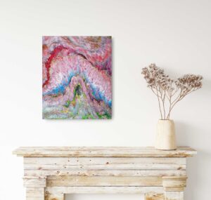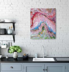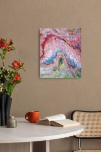 Maleriet er lakeret og kan modstå sollys og rengøring. Det kan afmonteres rammen og sendes med posten. Det er signeret på bagsiden.