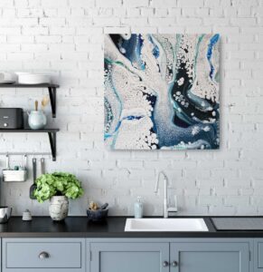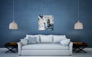 Maleriet fortsætter på rammen, som forlængelse af motivet. Maleriet er lakeret og kan modstå sollys og rengøring. Det kan afmonteres rammen og sendes med posten. Det er signeret på bagsiden.
